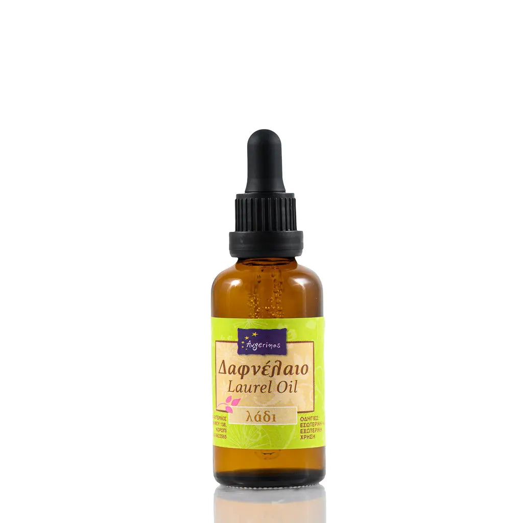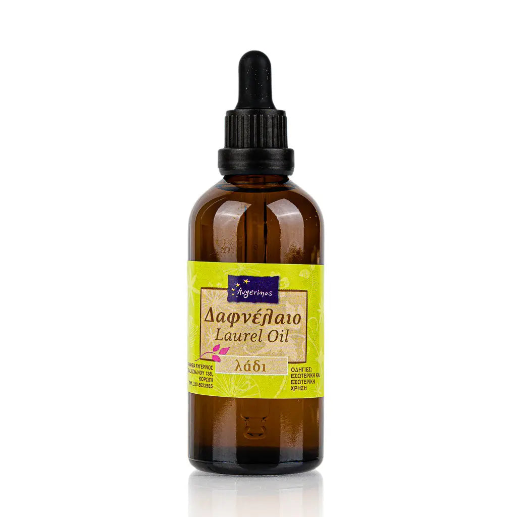 Γυάλινο Μπουκάλι με Δαφνέλαιο απο το εργαστήριο αρωματοθεραπείας του Φαρμακείου Avgerinos Pharmacy
