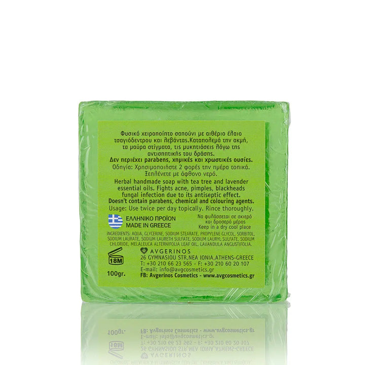 Jabón natural hecho a mano con árbol de té y aceite esencial de lavanda. Lucha contra el acné, manchas negras e infecciones fúngicas debido a su acción antiséptica excepcional.