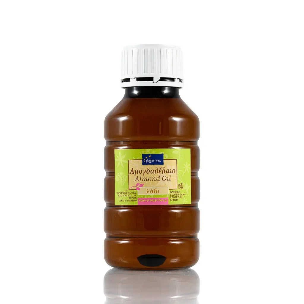 Γυάλινο Μπουκάλι με Αμυγδαλέλαιο απο το εργαστήριο αρωματοθεραπείας του Φαρμακείου Avgerinos Pharmacy